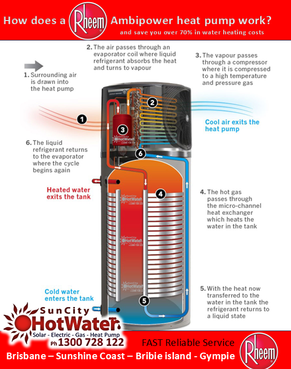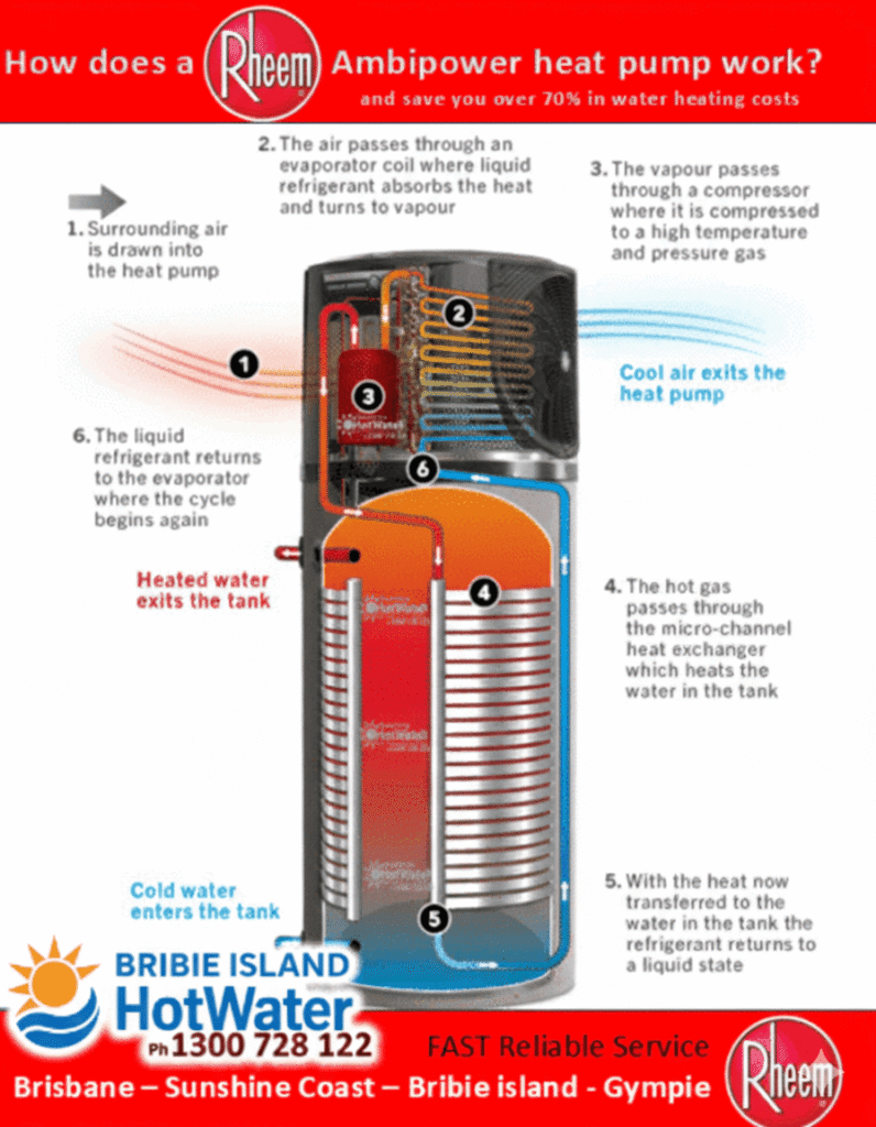 A heat pump operates on the same basic principle as an air conditioner or fridge, but instead of removing heat from a space it moves heat into water via pipes that wrap or sit inside the storage tank. Some models pump water through a heating plate to warm it before returning it to the tank. Electricity powers a compressor that circulates a refrigerant around the system; the refrigerant absorbs heat from the air and transfers it to the water.